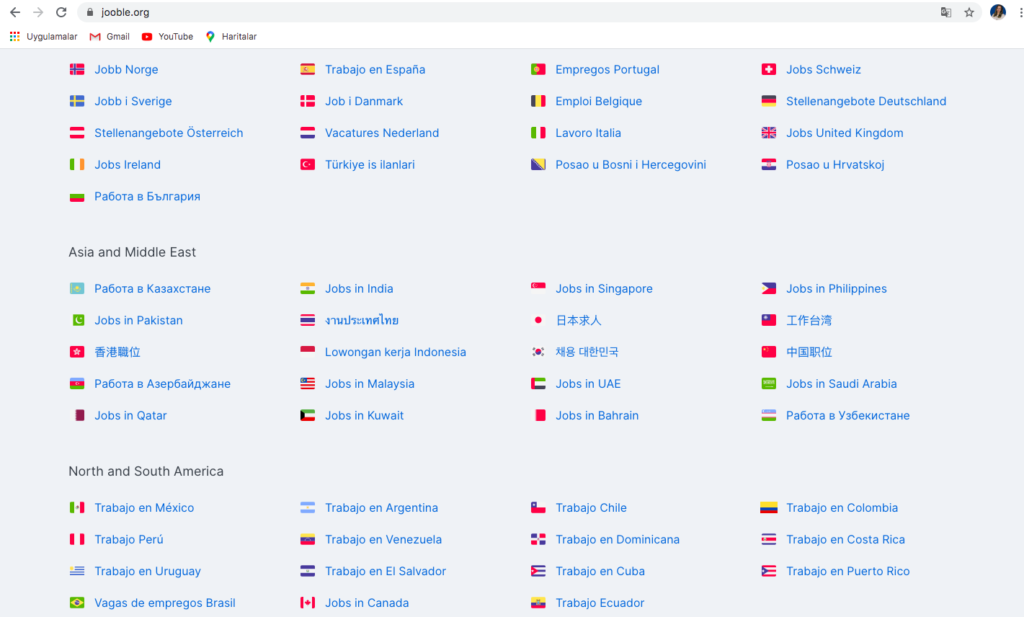 Jooble 71 ülkede faaliyet gösteriyor. Avrupa, Asya ve Orta Doğu, Kuzey ve Güney Amerika ülkelerinde… Buraya tıklayarak ilgilendiğiniz ülkenin Jooble’lına gidebilirsiniz.