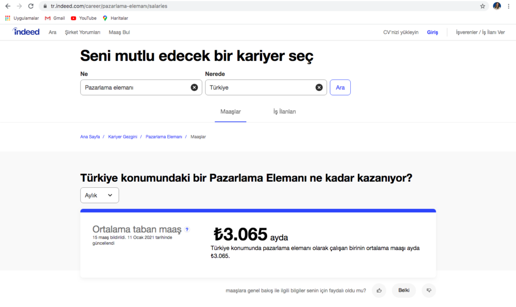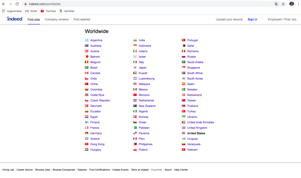 Indeed 2004 yılında ABD’de açılmıştır. Her ay 60’tan farklı ülkeden 250 milyonun üzerinde tekil ziyaretçisiyle dünyanın 1 numaralı iş sitesi olduğunu telaffuz ediyor. Saniyede 10 ilan ekleniyor, 175 milyon cv mevcut.