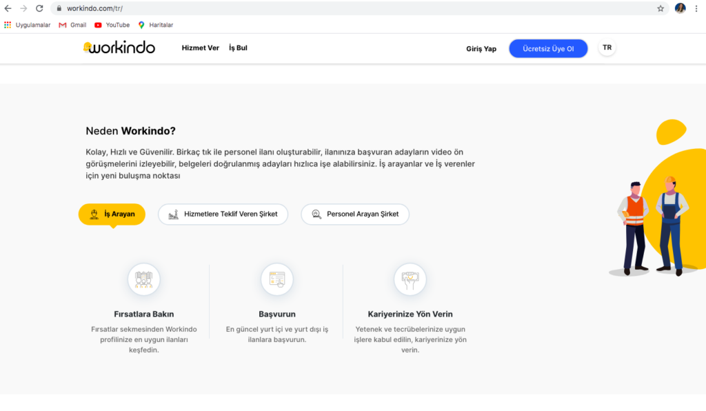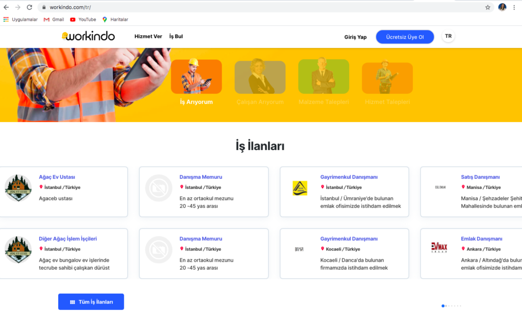 2019 yılında inşaat sektörü için kurulan Workindo, inşaat sektörünün çalışan bulma, taşeron bulma, projelere teklif vermesi için faaliyet gösteriyor. Müteahhit firmalar projeleri için ihtiyaç duyduğu tüm hizmetleri tedarik edebilir, alt yüklenici firmalar en güncel projelere teklif verebilir, inşaat sektöründe çalışanlar ise kendilerine en uygun projelere kolaylıkla başvurabilirler.