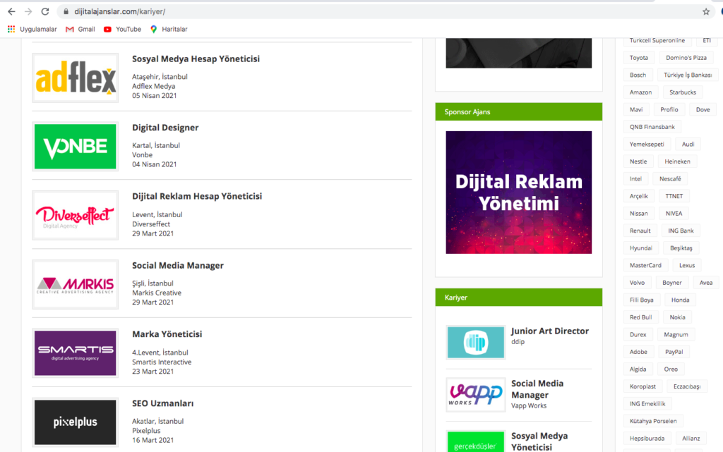 Dolayısıyla siz de dijital ajanslar, sosyal medya, seo, grafik tasarım, içerik üretimi gibi alanlarda iş arıyor ya da bu alanlara yönelmek istiyorsanız ilginizi çekebilir. Sitenin KARİYER sayfasını tıklayıp, iş ilanlarını inceleyebilirsiniz.