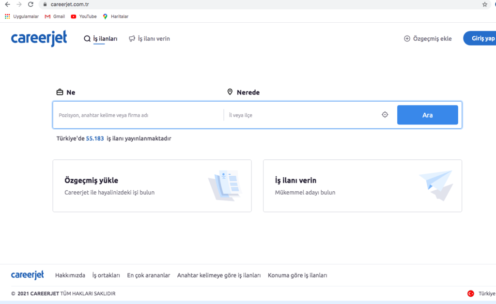 Global iş arama motoru Careerjet dünya çapında 90’dan fazla ülkede ve 28 dilde hizmet vermektedir. İş ilanları Careerjet tarafından barındırılmadan; kullanıcılar iş ilanının verildiği adrese yönlendirilirler. Careerjet, 58.000’den fazla web sitesini belirli aralıklarla tarar ve firmaların yayınladıkları iş ilanlarını işleyerek veri tabanına kaydeder. İstediğiniz role ve lokasyona yönelik arama yapabilirsiniz.
