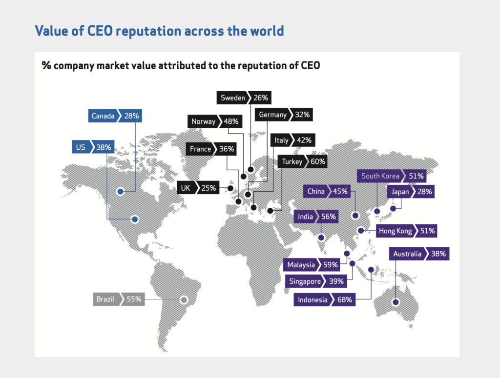 Weber Shandwick’in KRC Research ile birlikte gerçekleştirdiği global ölçekli bir analize göre; bir şirketin piyasa değerinin %44’ünün CEO’nun itibarına bağlı.
